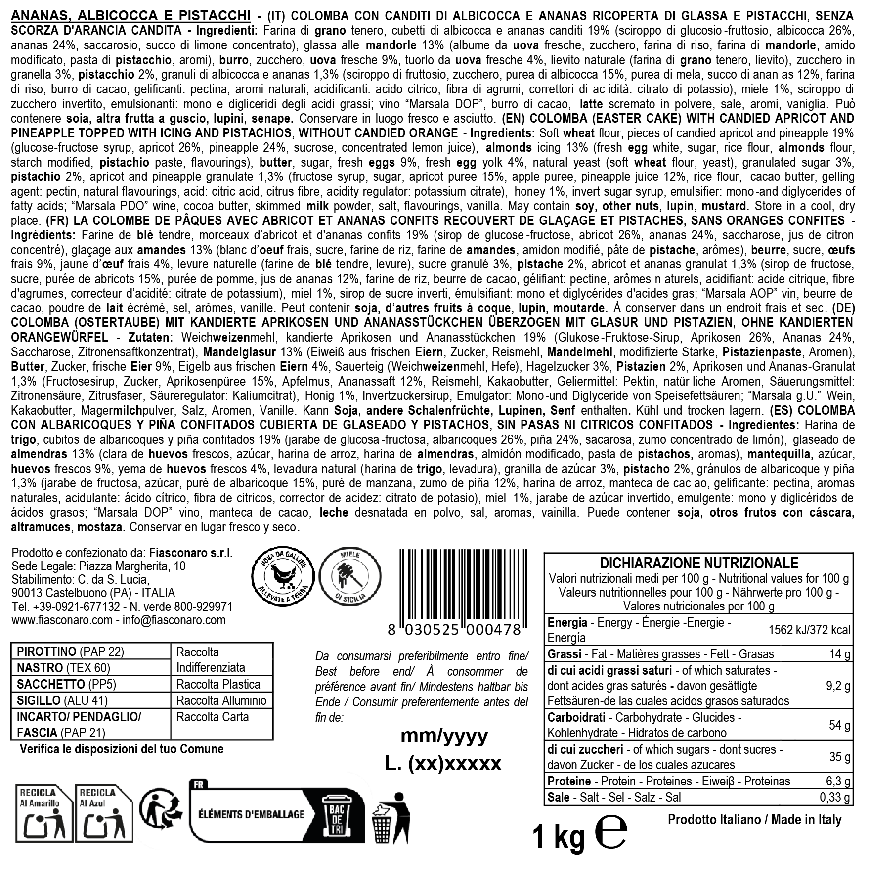 Prodotto e confezionato da: Fiasconaro s.r.l. Sede Legale: Piazza Margherita, 10 Stabilimento: C. da S. Lucia, 90013 Castelbuono (PA) - ITALIA